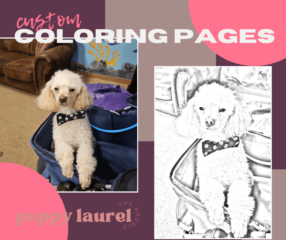 Custom pet coloring pages for your pet, therapy dog or show dog for hours of fun! Handouts for classrooms, therapy visits, breed promotion and more!